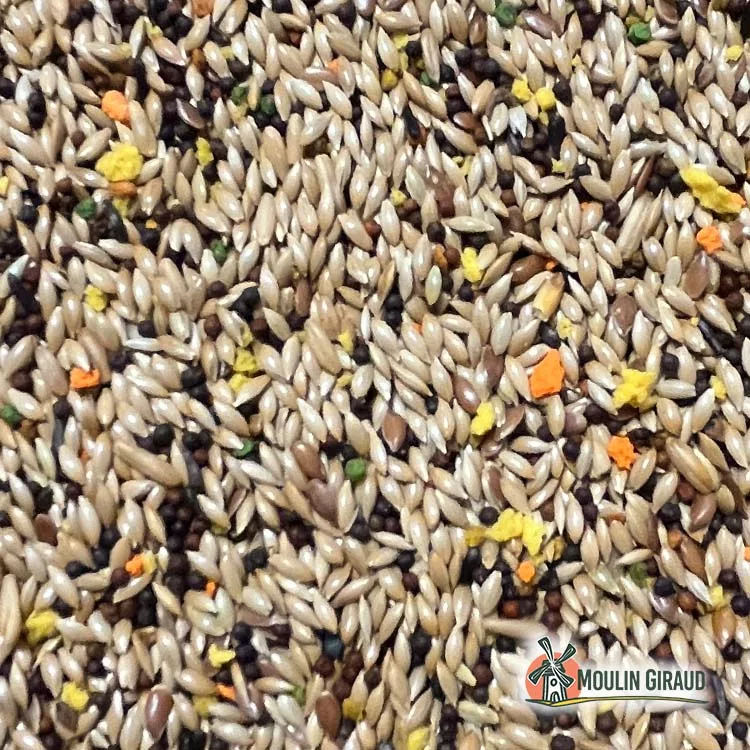 Alpiste 73%, navette 13%, avoine pelée 7%, graines de lin 3%, biscuit gourmet 2%, chanvre 1%, niger 1%.