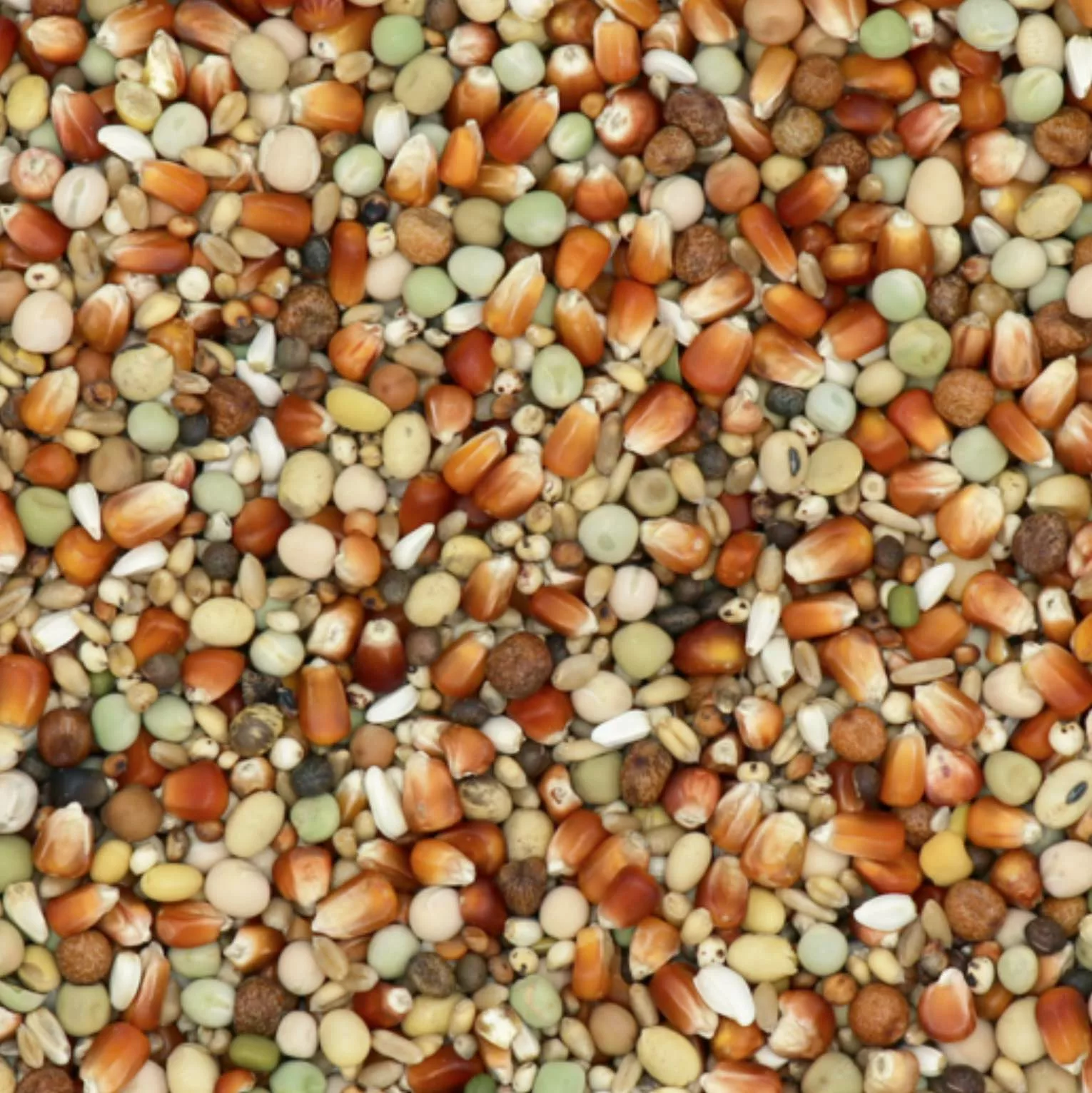 Maïs rouge 28%, Graines de soja toastées 4%, Maple peas 6%, Dun peas 4,5%, Pois jaunes 5,5%, Grands pois verts 3%, Petits pois verts 5,5%, Vesces 4%, Katjang Idjoe 0,5%, Froment blanc 15%, Dari jaune 7%, Dari rouge 7 %, Cardy 4,5%, Riz pelé 1 %, Avoine pelée 1%, Chanvre 1%, Sarrasin 0,5%, Millet blanc 1%, Graines de lin brun 1%.