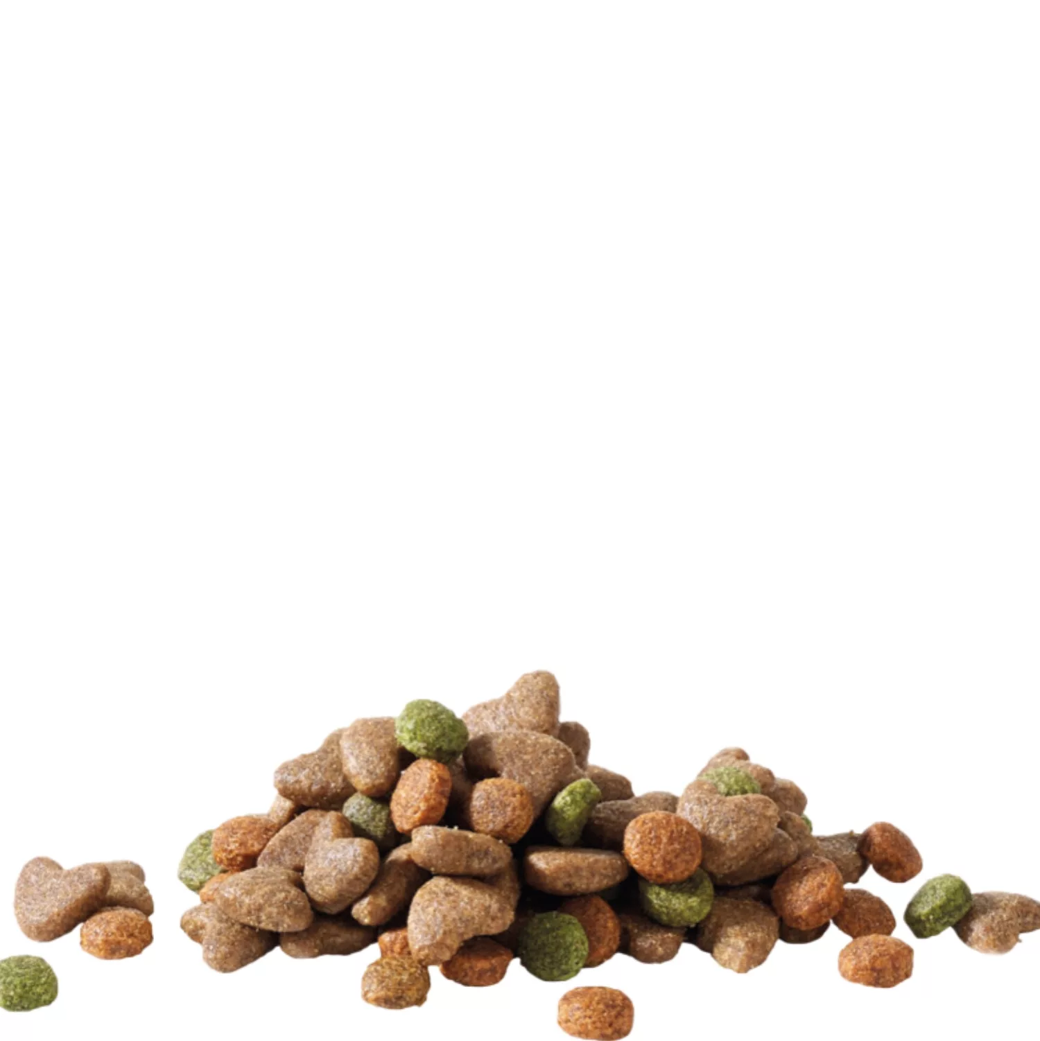 Viandes et sous-produits animaux (poulet 21%), céréales (riz 10%), sous-produits d’origine végétale, huiles et graisses, légumes (carottes 0,5% et brocoli 0,5%), graines, levures, substances minérales, fruits (pommes 0,5%).