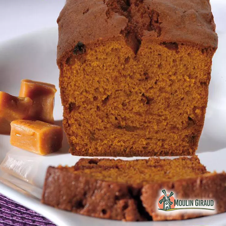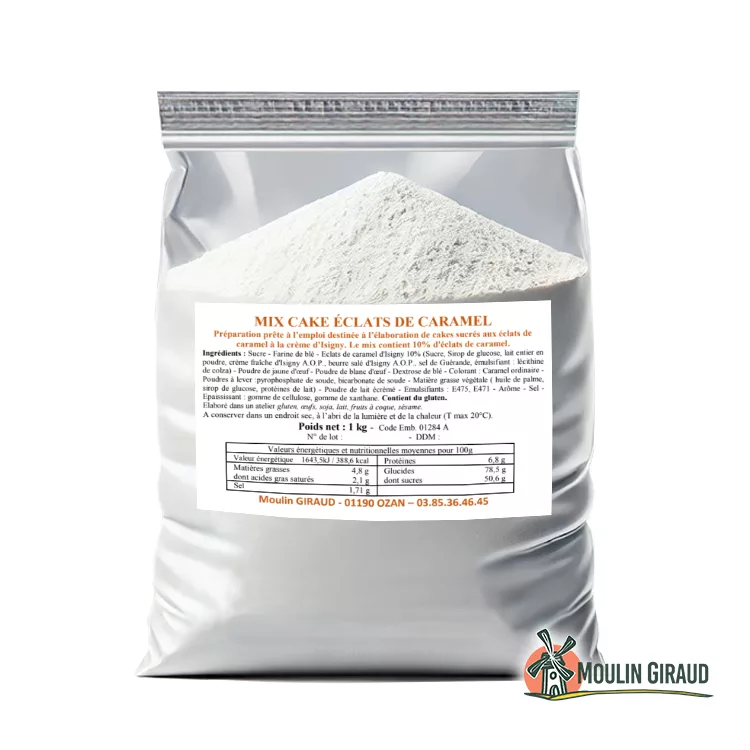 Préparation prête à l’emploi destinée à l’élaboration de cakes sucrés aux éclats de caramel à la crème d'Isigny. Le mix contient 10% d'éclats de caramel.