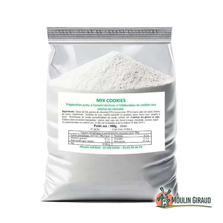 Préparation prête à l’emploi destinée à l’élaboration de cookies aux pépites de chocolat. Le mix contient 22% de pépites de chocolat.