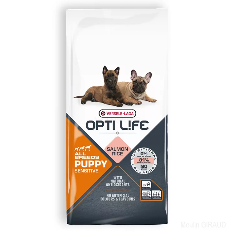 Opti Life Puppy Sensitive All Breeds est une formule parfaitement équilibrée à base de saumon et de riz, spécialement conçue pour les chiots ayant une digestion sensible (intolérances alimentaires) car elle soutient une flore intestinale saine (FOS, MOS).